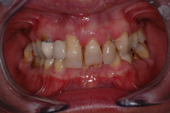 Fig.1 Caso clinico iniziale la paziente necessita di una riabilitazione implanto protesica superiore totale, si dovranno estrarre tutti i denti e consegnare nella stessa giornata un provvisorio fisso che abbia anche una estetica iniziale accettabile