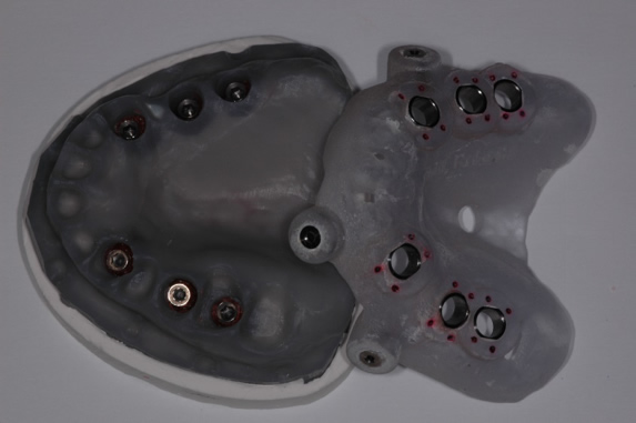 Fig.2 Attraverso il software visto nelle altre puntate è possibile sviluppare un modello del paziente con gli impianti già inseriti ed ottenere una dima di inserimento che ci guiderà ad inserire gli impianti nel cavo orale del paziente nella stessa posizione decisa virtualmente.